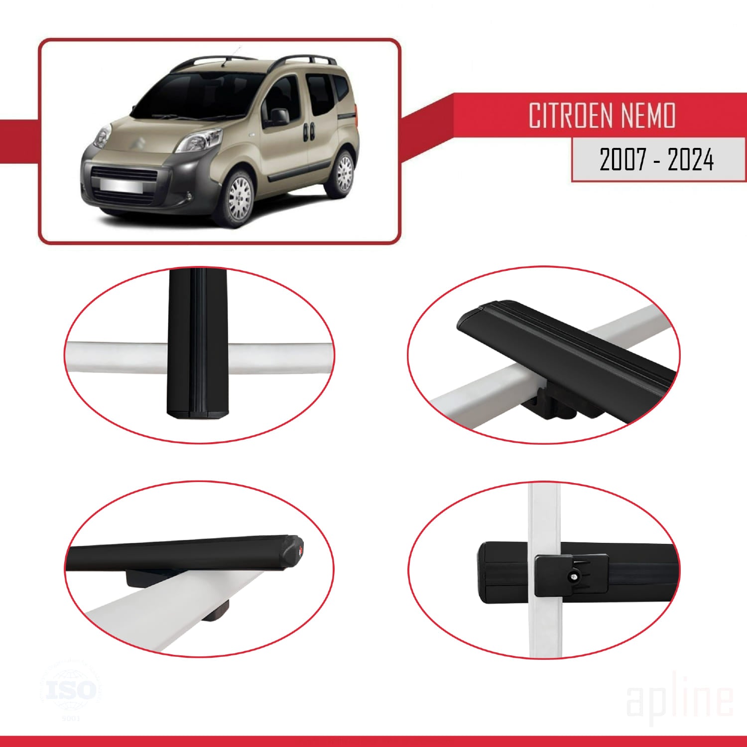 Kompatibel mit Citroen Nemo 3 (225) 2007-2024 Basismodell Dachgepäckträger, schwarzes Aluminium, 3 Stangen