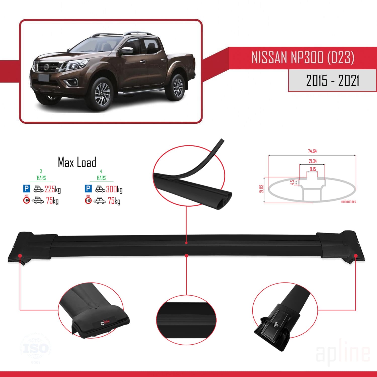 Compatible avec Nissan NP300 (D23) 2015-2021 FLY Model Barres de Toit Railing Porte-Bagages de Voiture Noir Aluminium 3 Barres