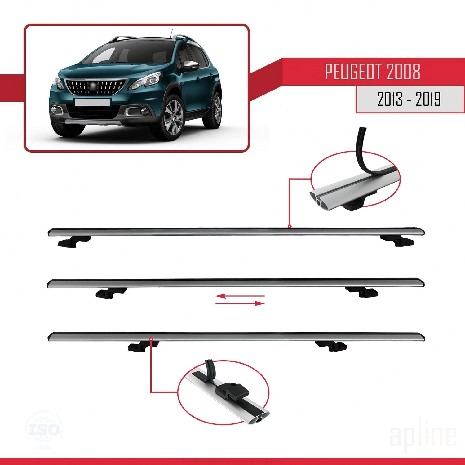 Compatible with Peugeot 2008 (A94) 2013-2019 BASIC Model Car Roof Rack Cross Bar Grey Aluminium 3 Bars
