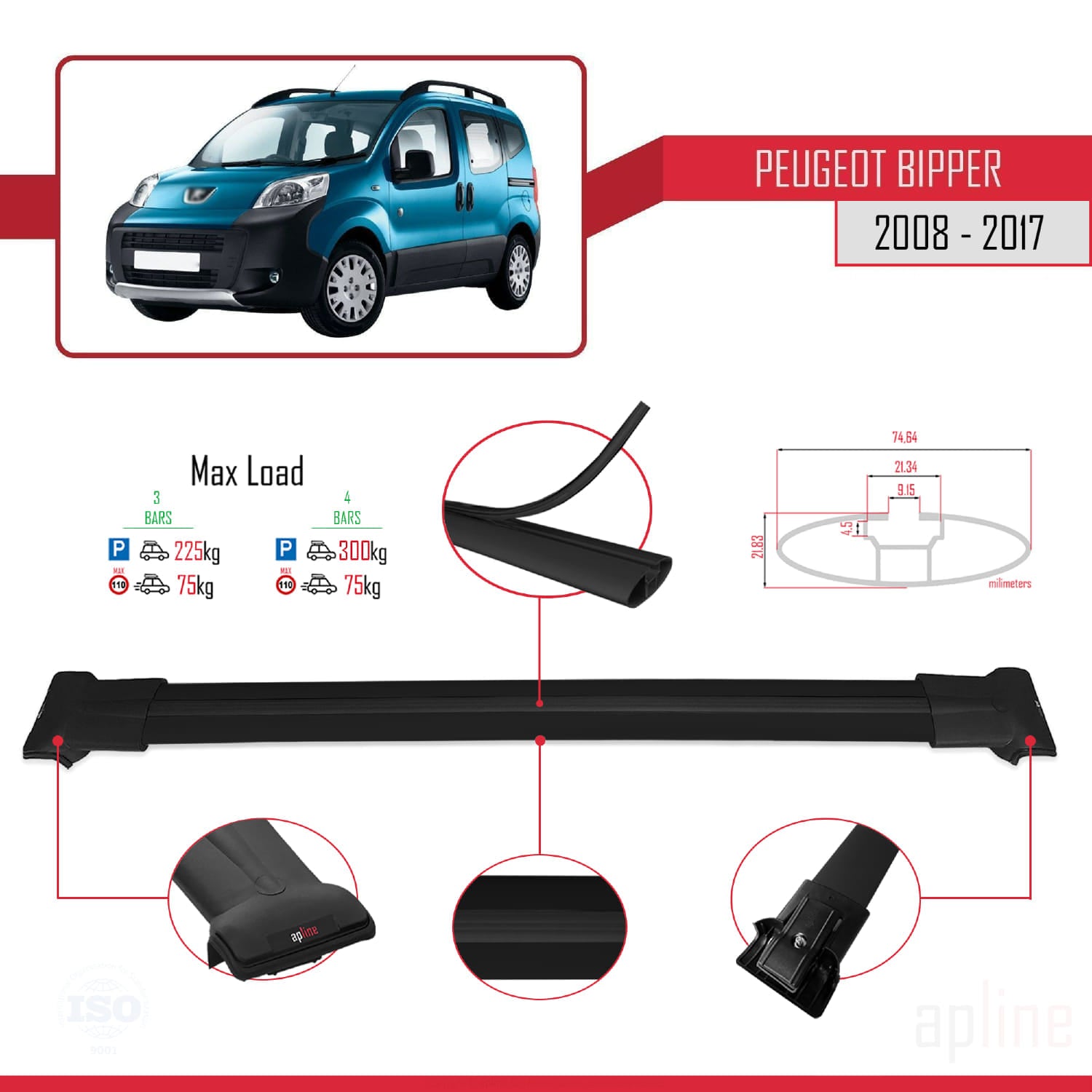 Compatible with Peugeot Bipper 2008-2017 FLY Model Car Roof Rack Cross Bar Black Aluminium 4 Bars