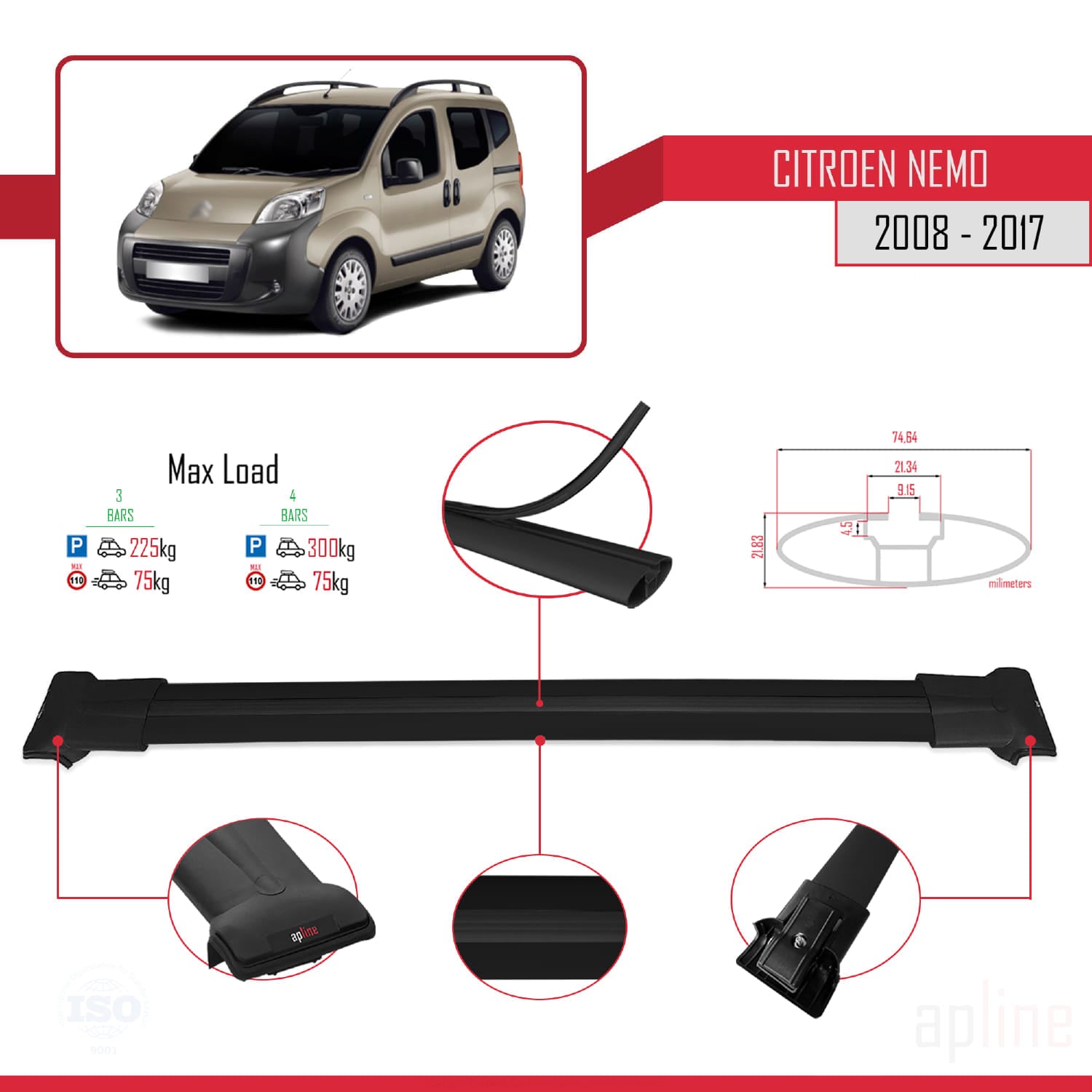 Compatible avec Citroen Nemo 3 (225) 2008-2017 FLY Model Barres de Toit Railing Porte-Bagages de Voiture Noir Aluminium 3 Barres