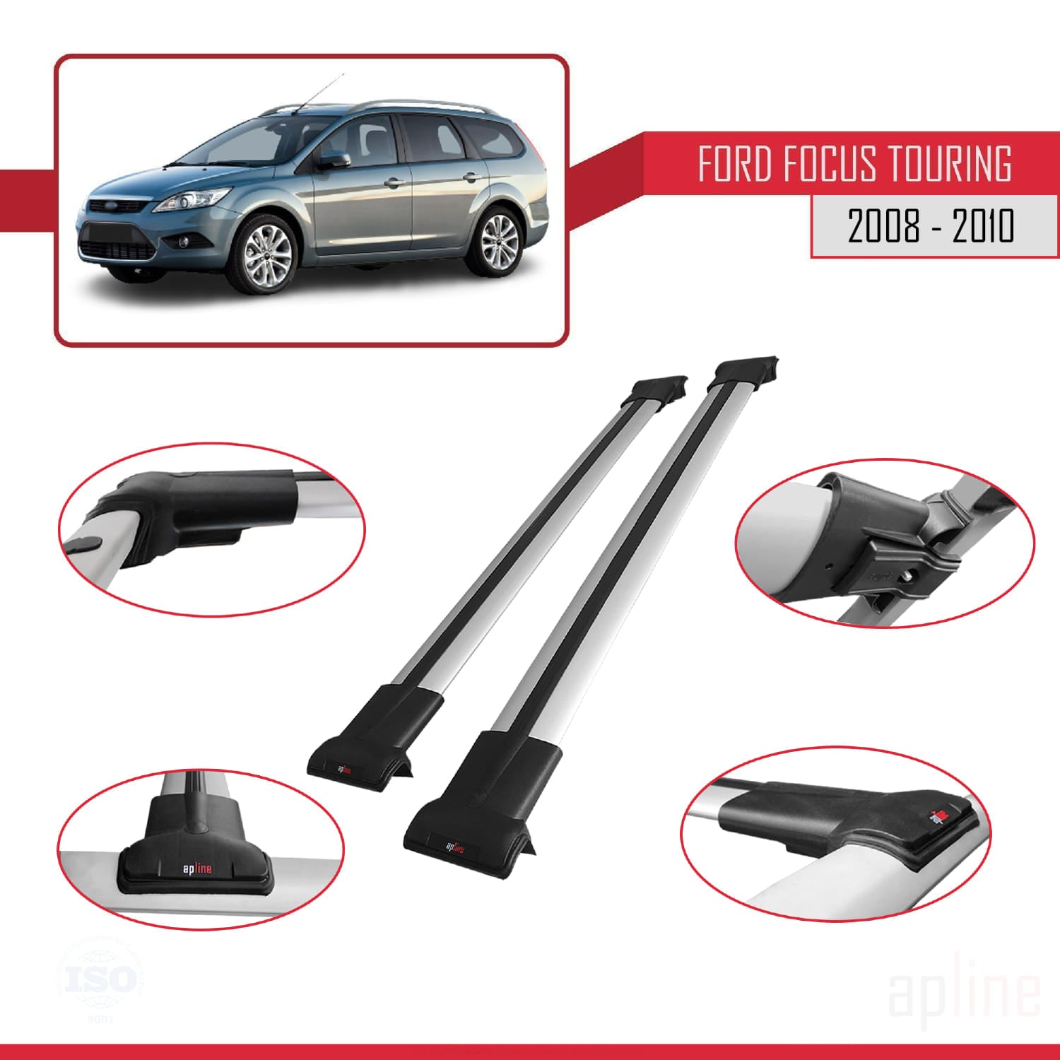Compatible avec Ford Focus 2 (C307) Turnier 2008-2010 FLY Model Barres de Toit Railing Porte-Bagages de Voiture Gris Aluminium 2 Barres