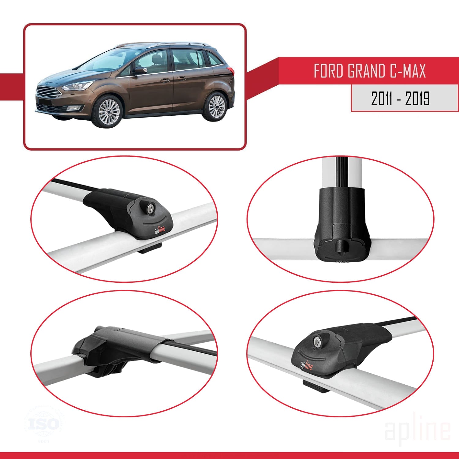 Compatible avec Ford Grand C-Max (C344) 2011-2019 ACE-1 Barres de Toit Railing Porte-Bagages de Voiture Gris Aluminium 3 Barres