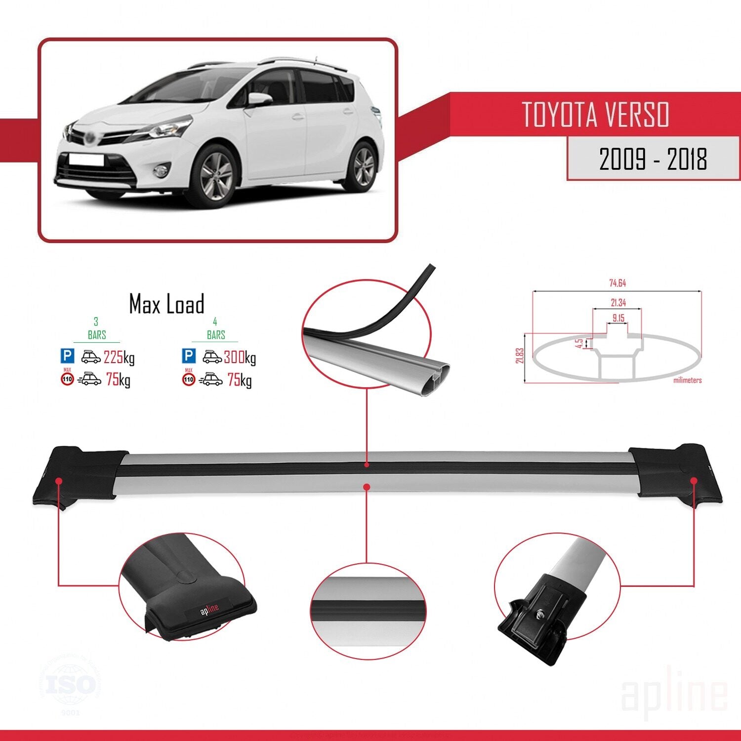 Compatible avec Toyota Verso (AR20) 2009-2018 FLY Model Barres de Toit Railing Porte-Bagages de Voiture Gris Aluminium 3 Barres
